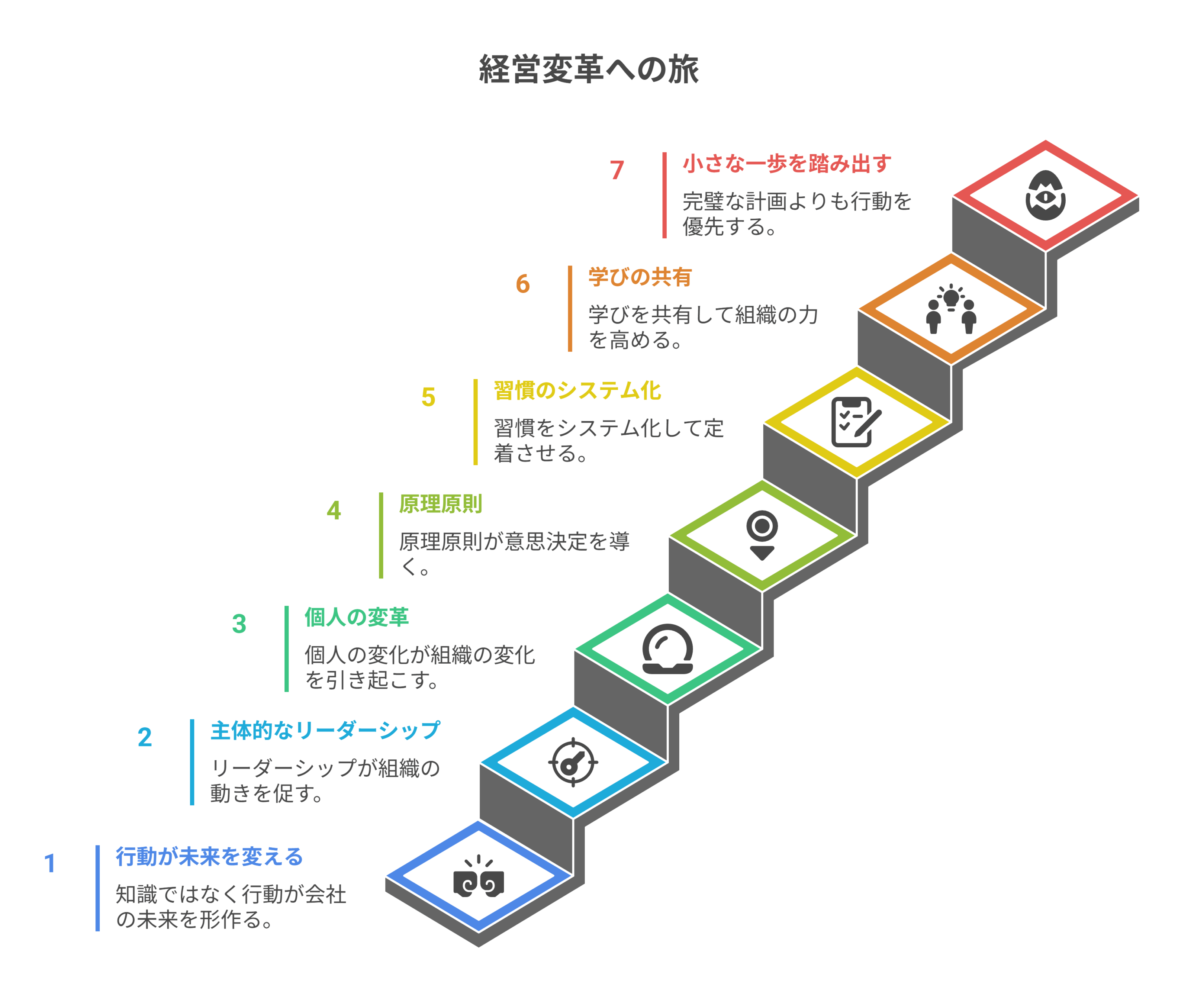 ここまでお伝えしてきたことを、経営の現場ですぐに実践するために整理すると、次の7つの視点にまとめられると思います。
