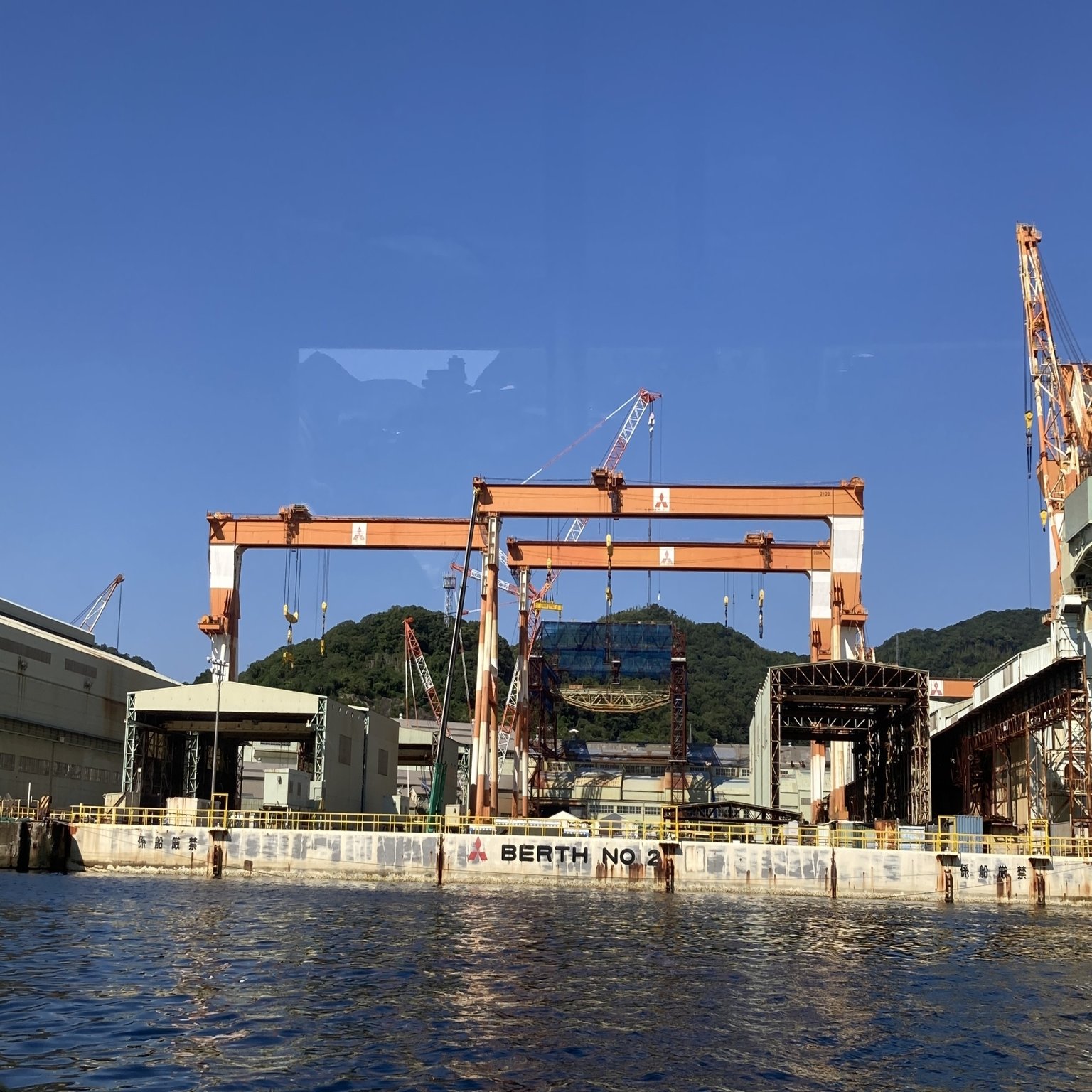 第二ドックは、大日本帝国時代に戦艦武蔵が建造された場所らしいです。当時使用されたクレーンはまだ残されているとのことです。
