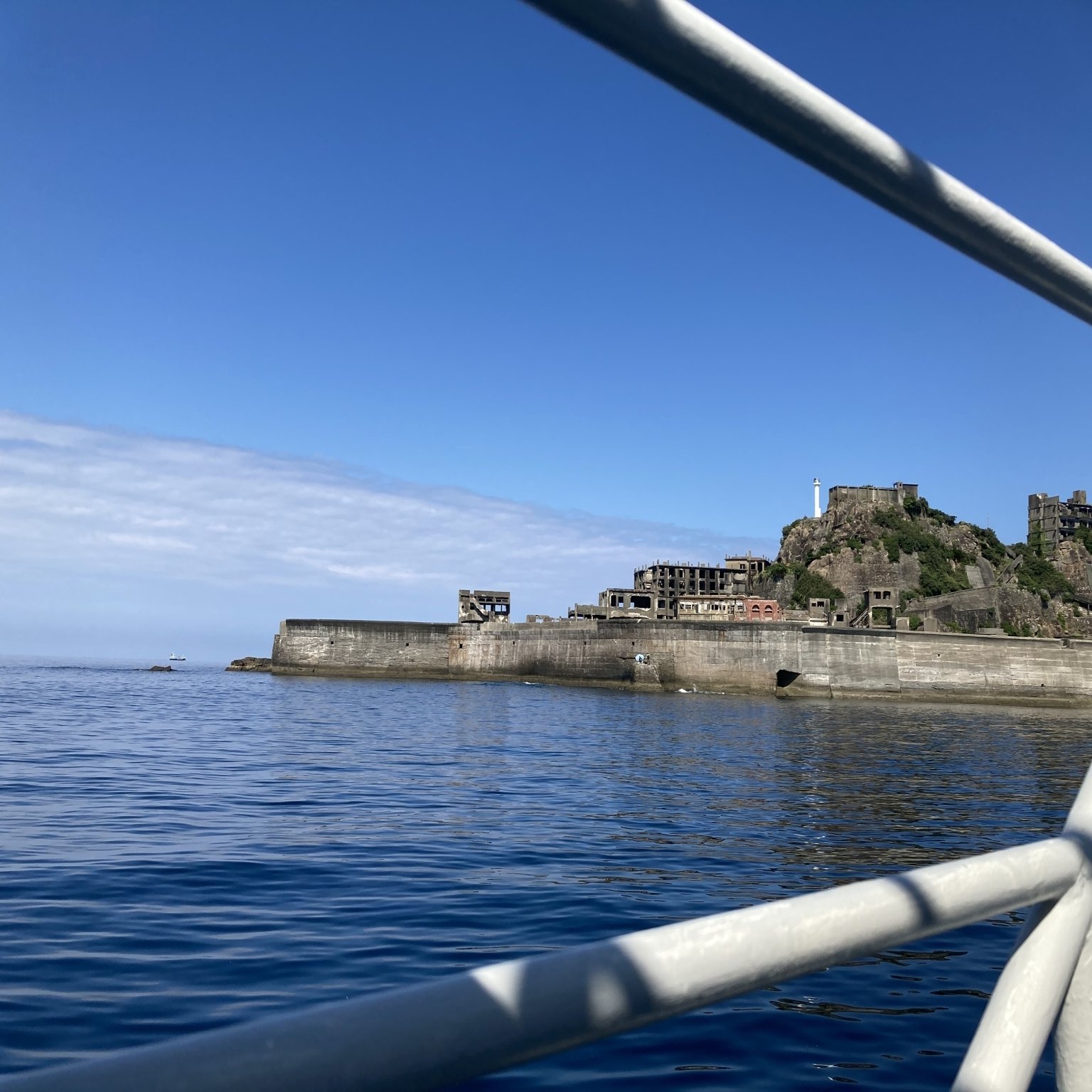 軍艦島に到着。周辺の波はとても静か。これなら期待できます。船は長崎市から上陸可否の連絡があるまで待機。島を周回しながら連絡を待ちます。