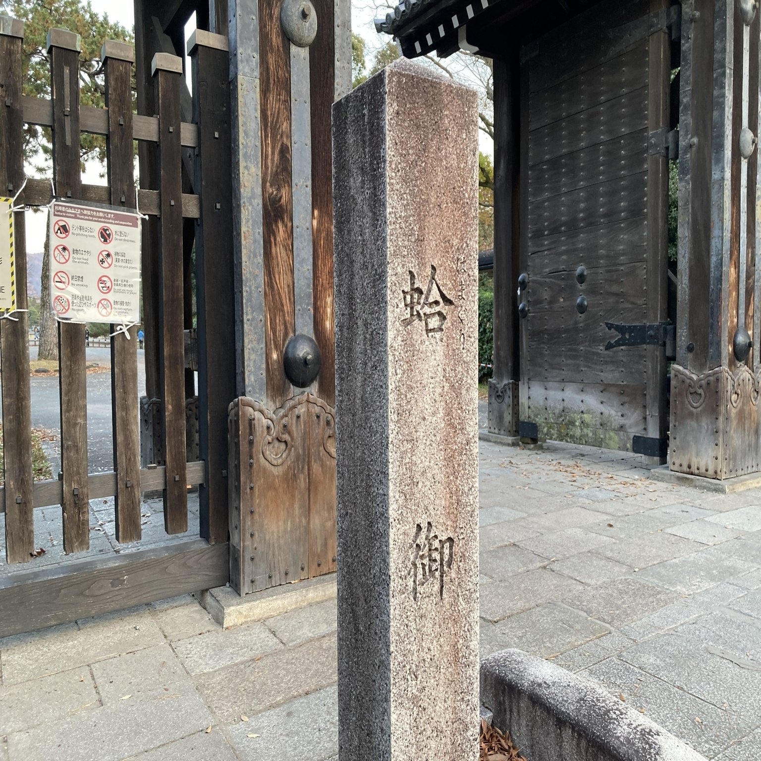 お参りを済ませ、再び歩き始めて程なく御苑の入り口に到着。門を潜りながら「ここ何という門だっけ?」と、門柱にある案内を確認してみると・・・「蛤御門!!あの蛤御門(禁門)の変の?!」。