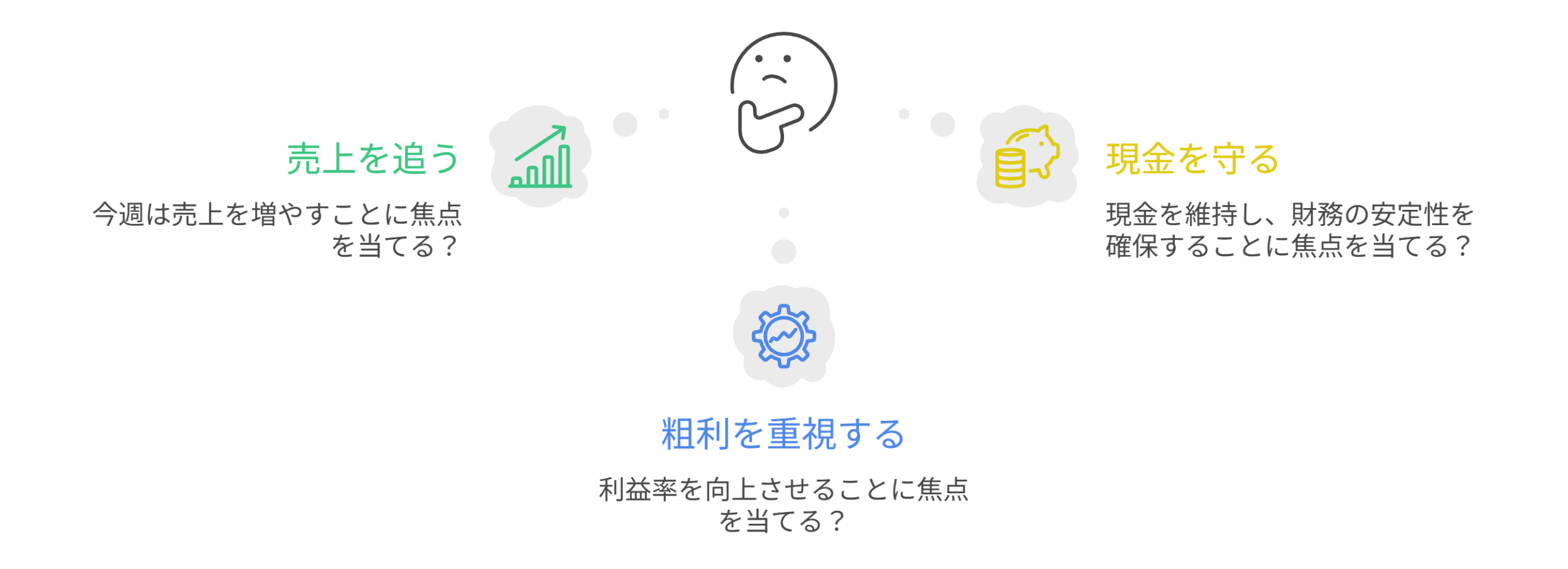 この3つがパッと見えると、今週は売上を追うべきか? 粗利(利益率)を重視すべきか? 現金を守るべきか? といったことが判断がしやすくなります。